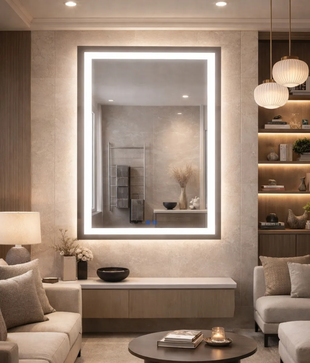 Usar o espelho orgânico com LED na decoração é mais simples do que parece. No banheiro, ele pode ser instalado acima da bancada, substituindo o espelho tradicional e elevando o nível do ambiente. Na sala, o espelho pode ser posicionado em paredes estratégicas para refletir luz natural ou pontos de iluminação.