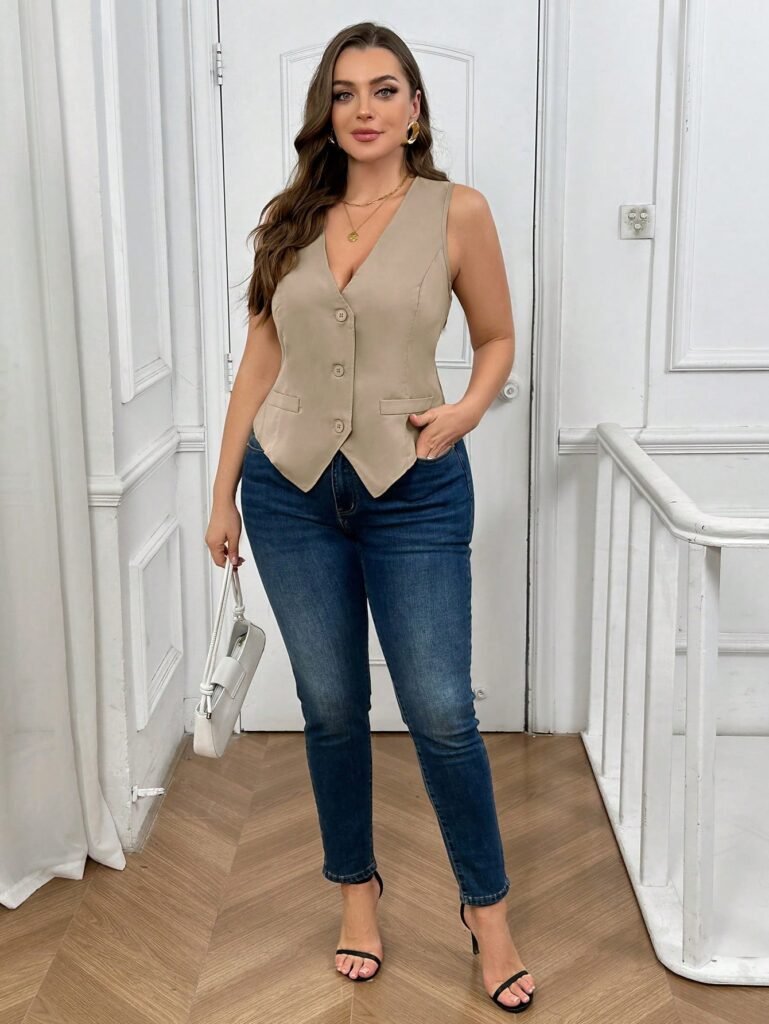 Uma terceira peça bem escolhida transforma qualquer produção em roupa que disfarça a barriga. Blazers alongados, coletes abertos e cardigãs criam linhas verticais que afinam o visual e desviam o foco da região abdominal.